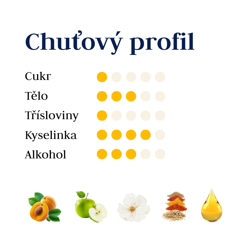 Vůně: citrusová kůra, zelené jablko a bílé květy se prolínají s lahodným tónem sušených meruněk a lehkou medovou stopou z botrytických bobulí; podprahově už probleskuje jemná kořenitost.